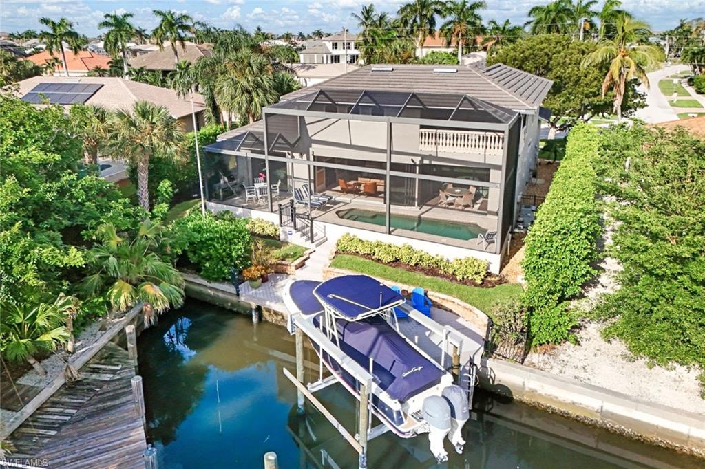 Welcome to Tigertail Beach living on Marco Island! This gorgeous turn-key home has it all including waterfront views, quick direct beach & boating access PLUS the 2018 ChrisCraft Calypso 26 ft Cruiser on the lift can be sold also (separately through SYC Yachts) making this the complete island package. This custom 3 BR, 3.5 bath canal home features a chef's dream kitchen with gas range, double ovens & an island great for meal prep, plus a corner desk & it opens directly to the screened pool deck dining area. The soaring ceilings & high windows of the living room capture & project sunlight throughout the home making it a great space for entertaining. The living room sliding doors pocket into the wall allowing for sea breezes to flow within & the alcove minibar is the perfect spot for crafting sunset cocktails. There are two equivalent-sized bedrooms on the main level and one could also be a 2nd primary option, as it is an ensuite. The back bedroom has its own private slider entry to the pool deck & shares the main hallway bath. Up the stairway, you will find the Owner's Suite with French door entry, a private terrace with incredible long water views and a large bathroom w/dual sinks, jetted spa-style tub, a separate shower & water room, plus linen storage & a walk-in closet. For storm protection, the residence has a new automated shutter for the front porch entrance, Pella impact glass windows & the BFE = 10 ft. 2018 Roof & Screen Enclosure. The home's pool heater & gas range are powered by a buried 500 gallon gas propane tank in the side yard. The 2012 boat lift (10K) was also just upgraded in 2024. Additional upgrades: Fenced backyard, landscape lighting, 2 Nest Smart Thermostats with separate room control sensors & storage cabinets added in garage. Did I mention the home comes full service with all furnishings inside including linens, dishes & cutlery...Ready for you & your family to step right into island living at its best!